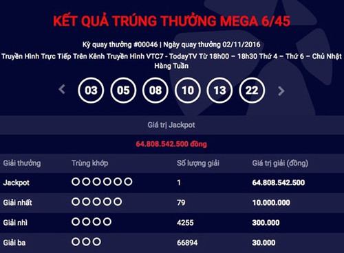 Ngày 16/10 vừa qua đã đi vào lịch sử ngành vé số Việt Nam khi lần đầu tiên có người trúng giải Jackpot (độc đắc vé số Vietlott) số tiền khủng: 92 tỷ đồng. Khi “cú sốc” Vietlott 92 tỷ chưa nguôi, thì ngày 2/11, thần may mắn mang tên vé số điện toán lại gõ cửa một khách hàng trúng với số tiền 64 tỷ đồng. Mới đây nhất, kỳ quay thứ 51 xổ số Mega 6/45 ngày 13/11 đã tìm được người trúng xổ số giải đặc biệt 71 tỷ đồng