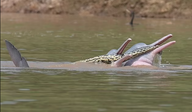Trong cuộc gặp gỡ kỳ lạ hơn bao giờ hết, hai con cá heo đực thoải mái bơi lội trên sông và đang chơi đùa với một con trăn beni anaconda.