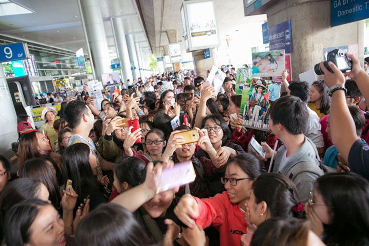 Phan Thị Mơ được fans vây kín ở sân bay.