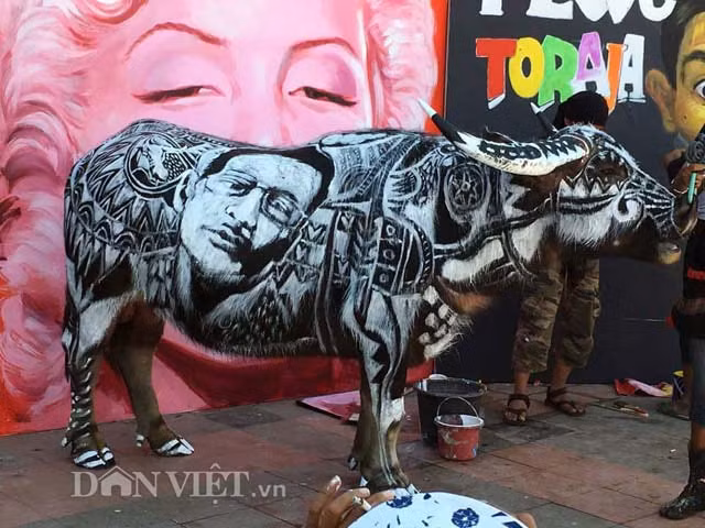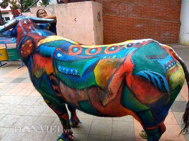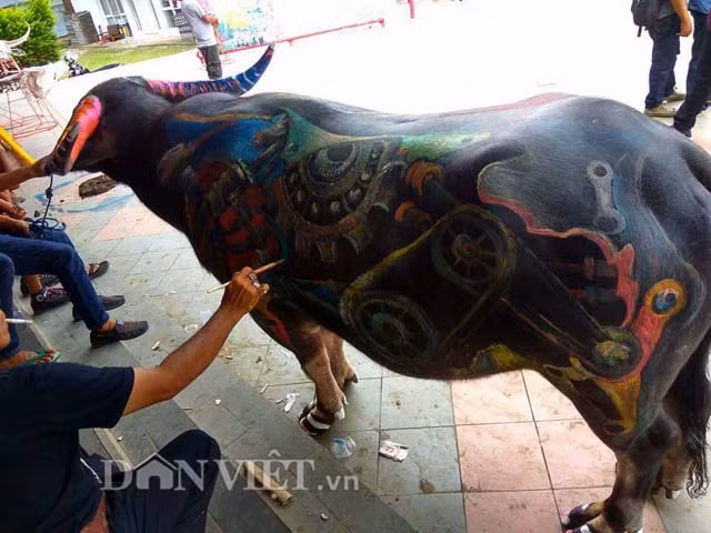 Để trang điểm được những con trâu như thế này, nhiều người đã phải bỏ ra nhiều tiếng đồng hồ dùng bình xịt, sơn và bút vẽ để tạo hình những các tranh trừu tượng trên khắp mình con trâu.