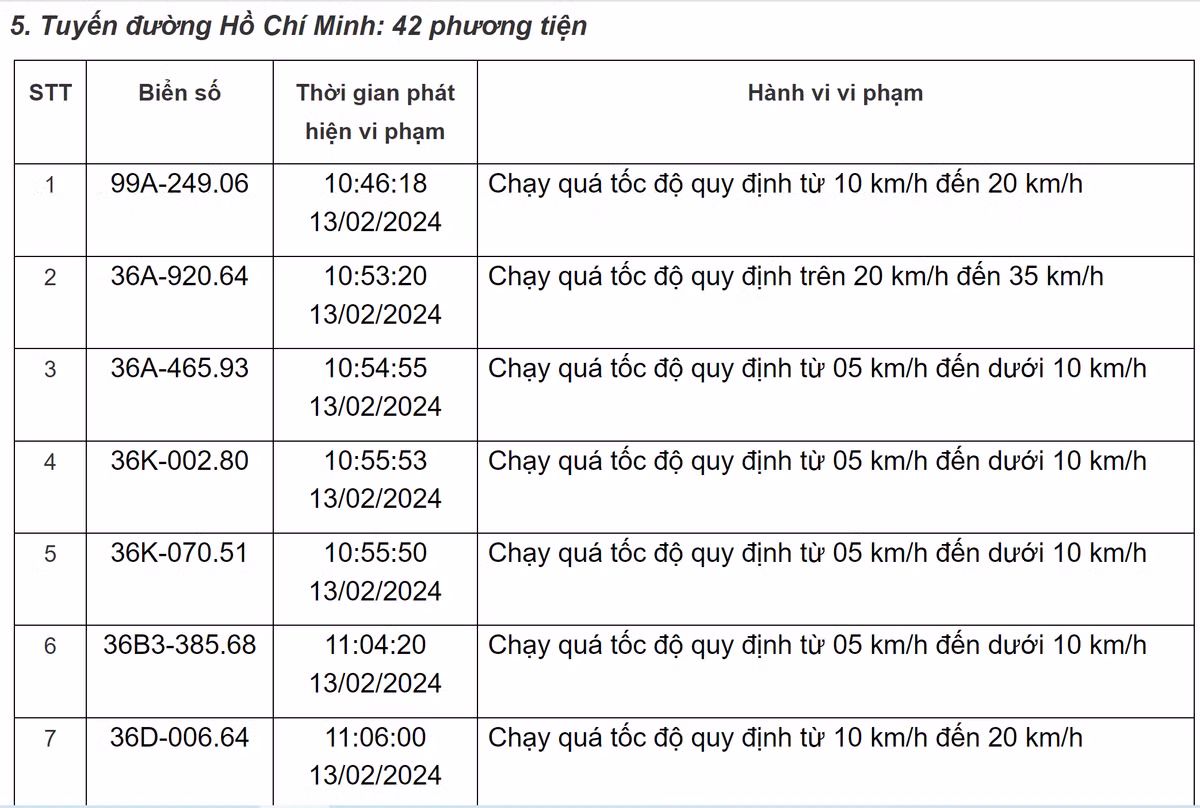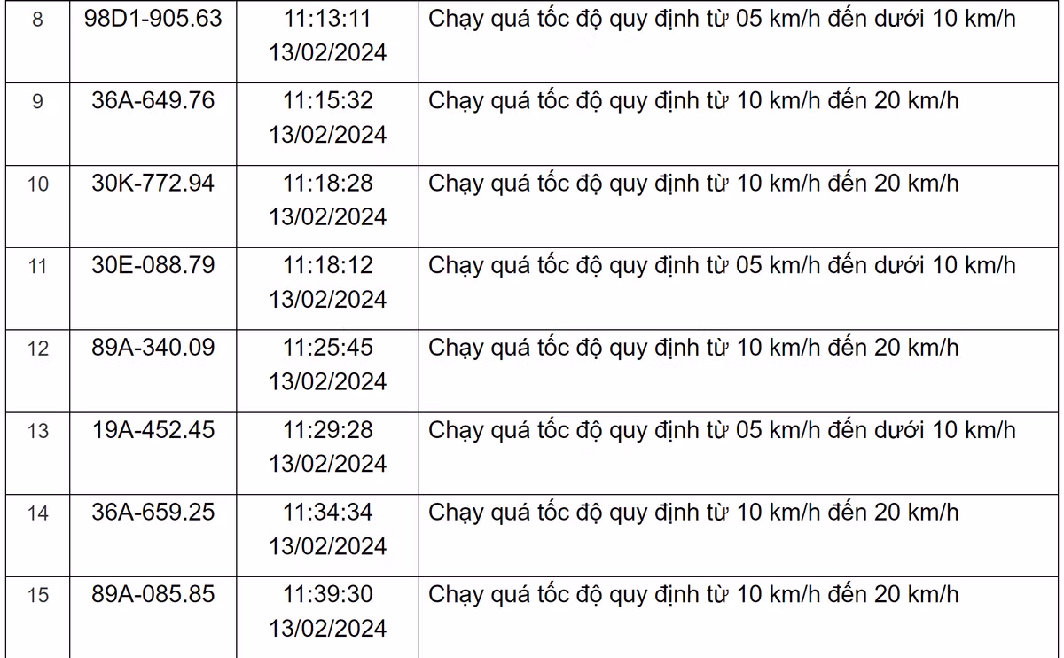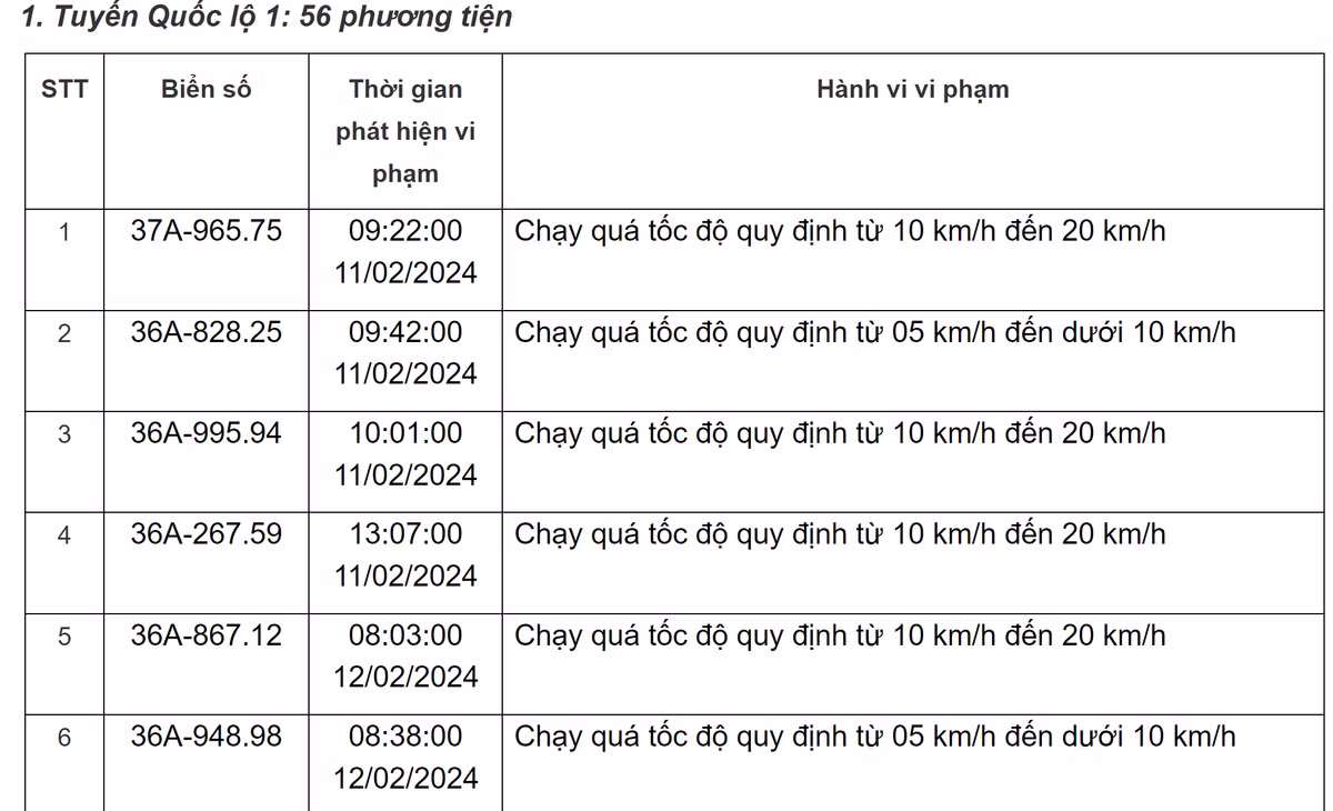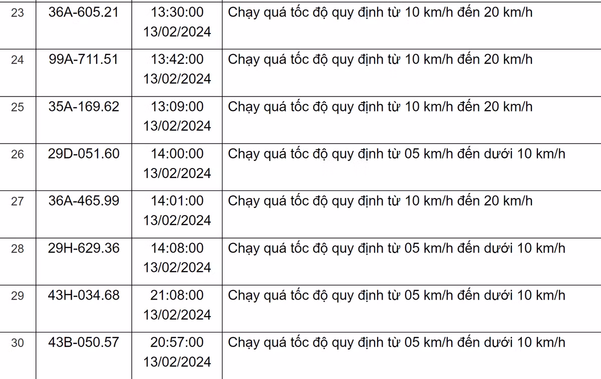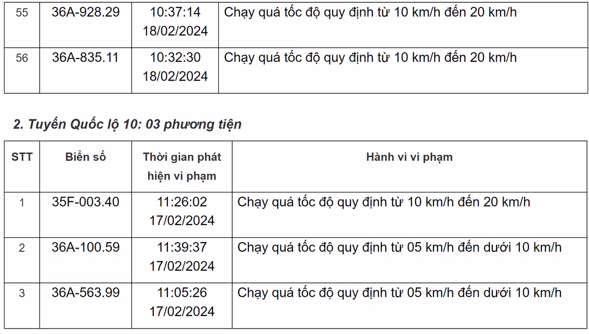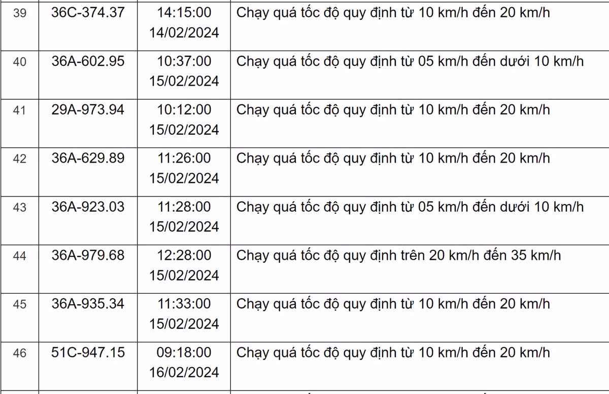 Công an Thanh Hóa vừa công khai danh sách 150 phương tiện vi phạm quy định về tốc độ trên các tuyến Quốc lộ, đã gửi thông báo phục vụ “Xử phạt nguội” từ ngày 11- 20/02/2024: