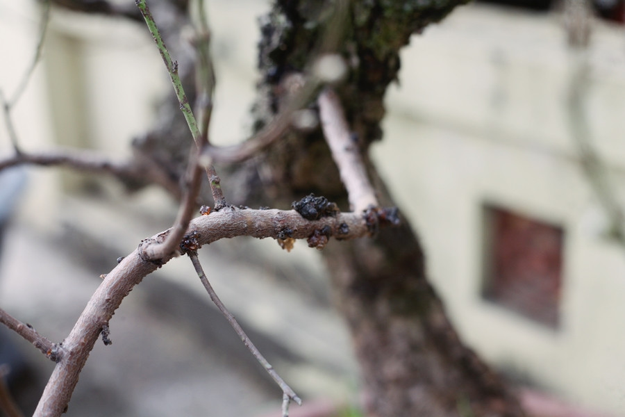 Gốc đào cổ có hai nhánh, già cỗi với những vết mục. Mới nhìn, tưởng rằng gốc cây đã bị chết, nhưng ở phía trên hoa đào đang đua nhau bung nở đỏ rực.
