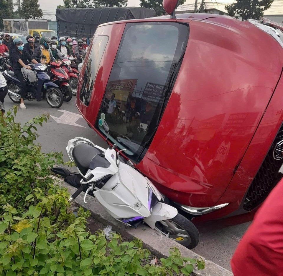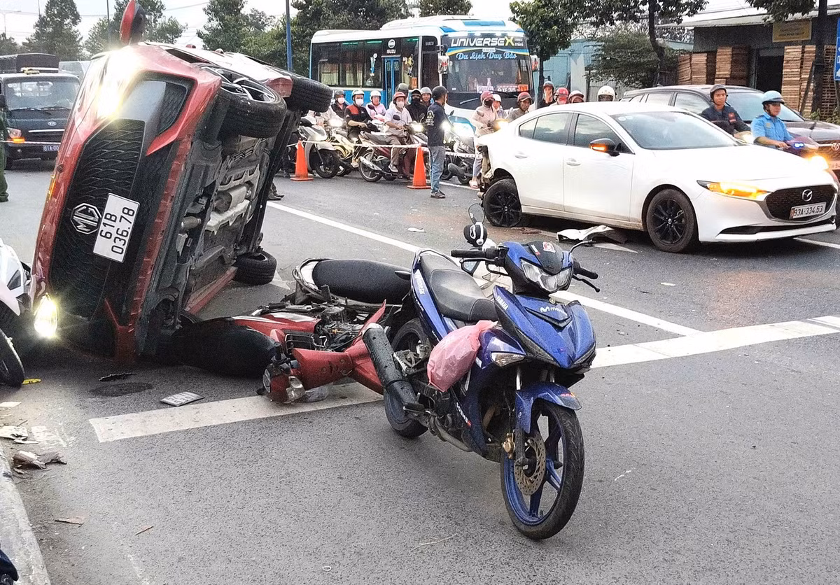 Tại hiện trường, ô tô biển 61B-036.78 bị lật nghiêng, xe 5 chỗ khác hư hỏng phần đuôi, nhiều xe máy nằm la liệt giữa đường. Vụ làm một số người bị thương nhẹ.
