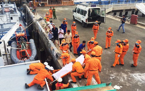 Trước đó, hai thuyền viên được tìm thấy là anh Trần Quốc Long (37 tuổi, ngụ huyện Xuyên Mộc, tỉnh BRVT), Lê Văn Duyên (47 tuổi, ngụ huyện Hàm Tân, tỉnh Bình Thuận) đã được gia đình nhận dạng thi thể.