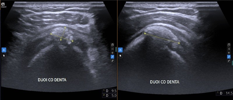 Kết quả siêu âm khớp vai của bệnh nhân phát hiện vôi hóa gân trên gai vai phải, kèm theo hình ảnh viêm bao hoạt dịch dưới cơ delta. Ảnh Medlatec