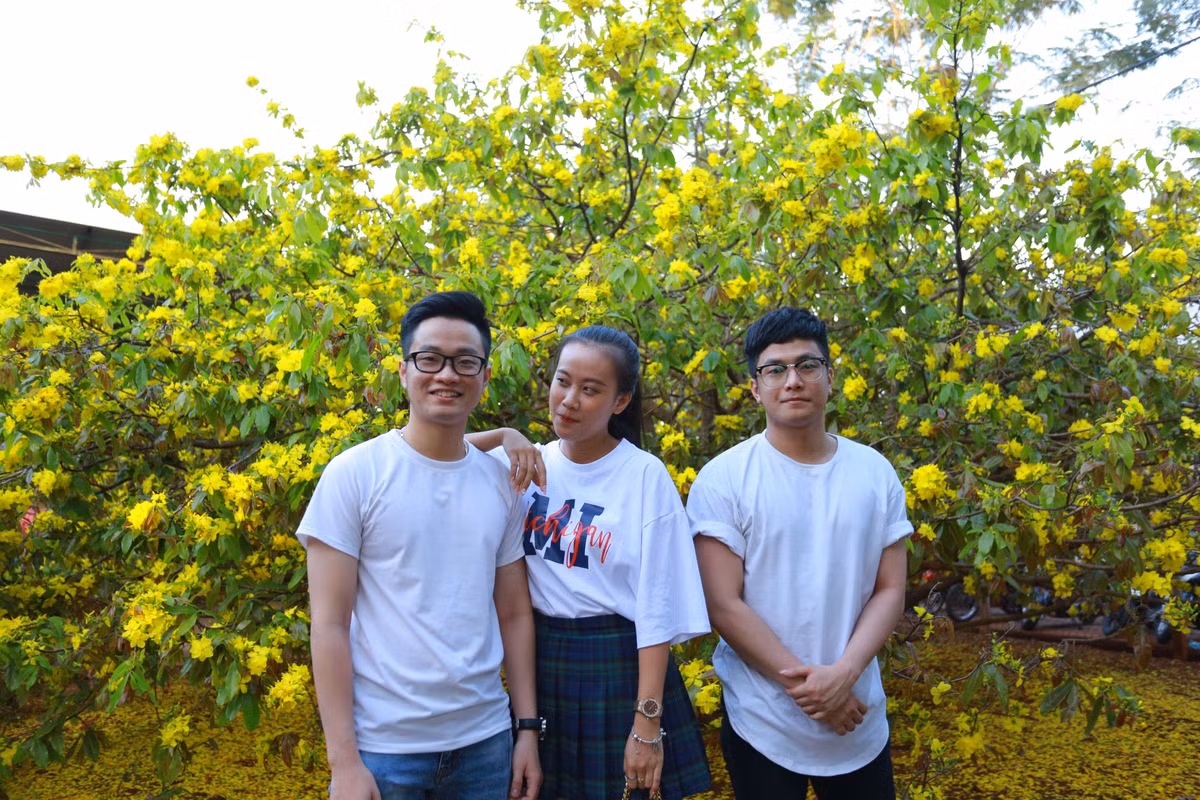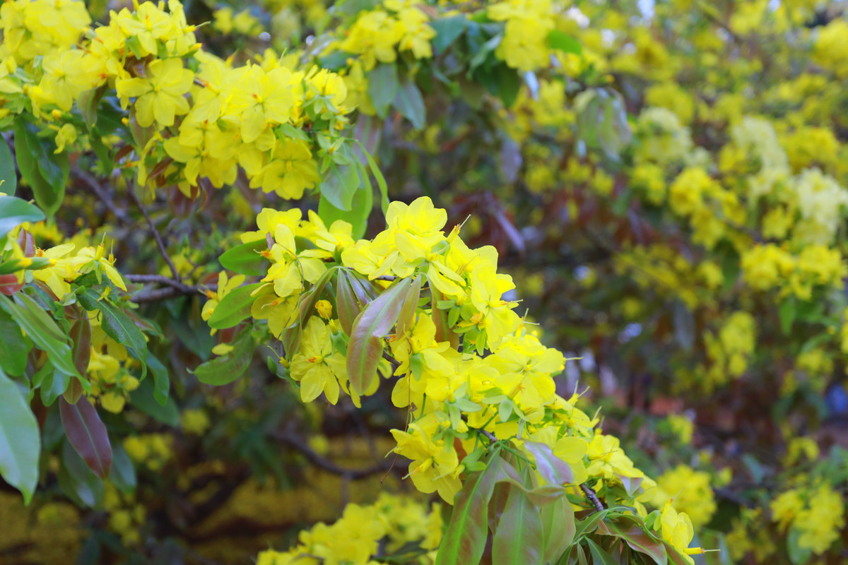 Cây có rất nhiều nhánh, cánh hoa mai rụng vàng rực tỏa ra và vươn cao bao phủ một khu đất rộng lớn.
