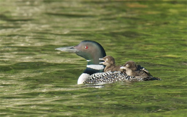 Những con non thuộc loài chim lặn Gavia đang được mẹ cõng trên lưng. Đây không đơn thuần chỉ là cách chim mẹ giúp chim con di chuyển theo kịp những cá thể trưởng thành khác trong đàn, mà còn nhằm giúp chúng giữ ấm và bảo vệ các con khỏi các động vật săn mồi cả trên không cũng như dưới nước.