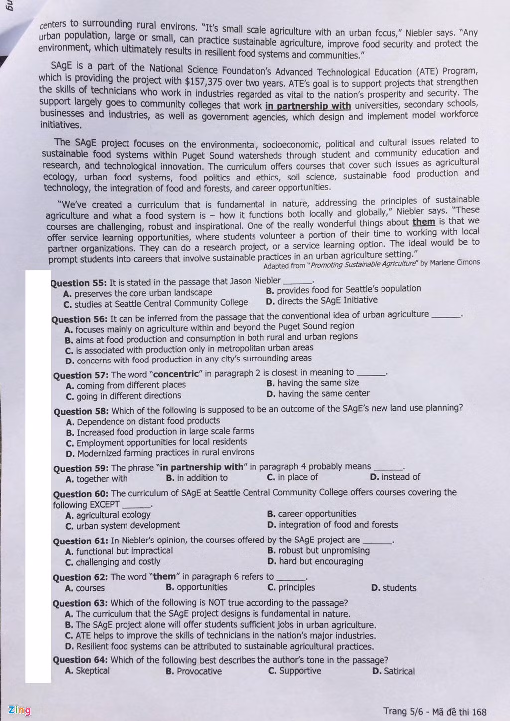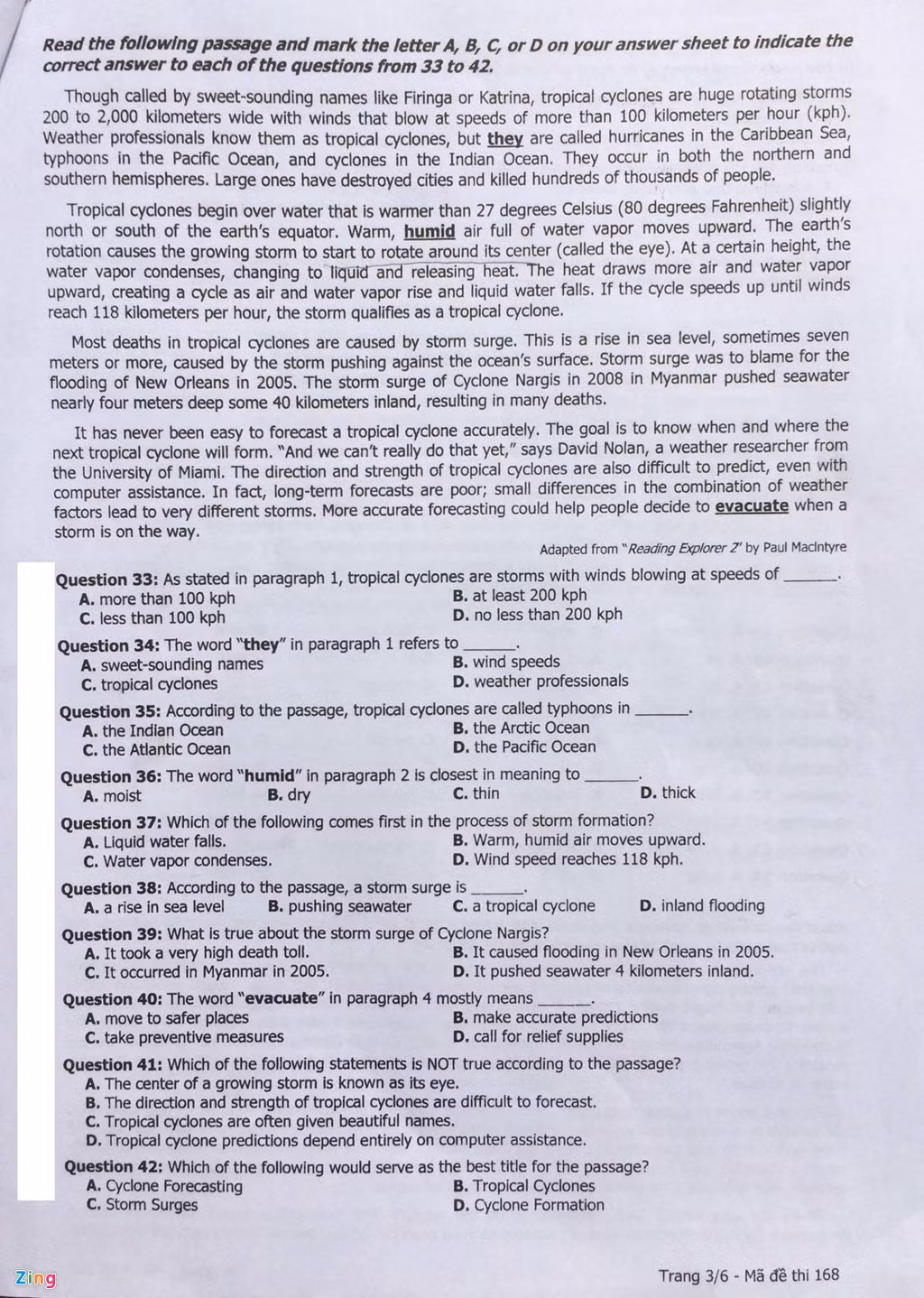 Đề thi môn Tiếng Anh THPT quốc gia 2016, Mã đề 168.