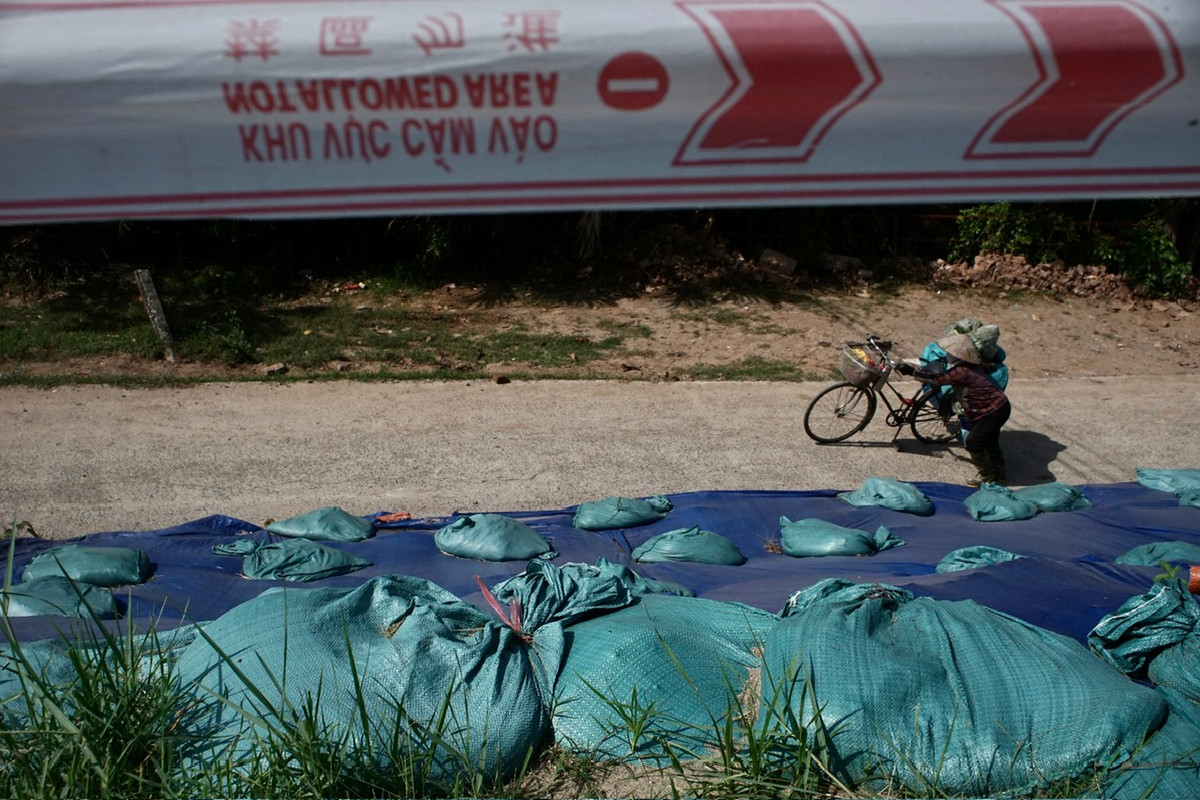 Các bao cát được gia cố cho đê Yên Nghĩa.