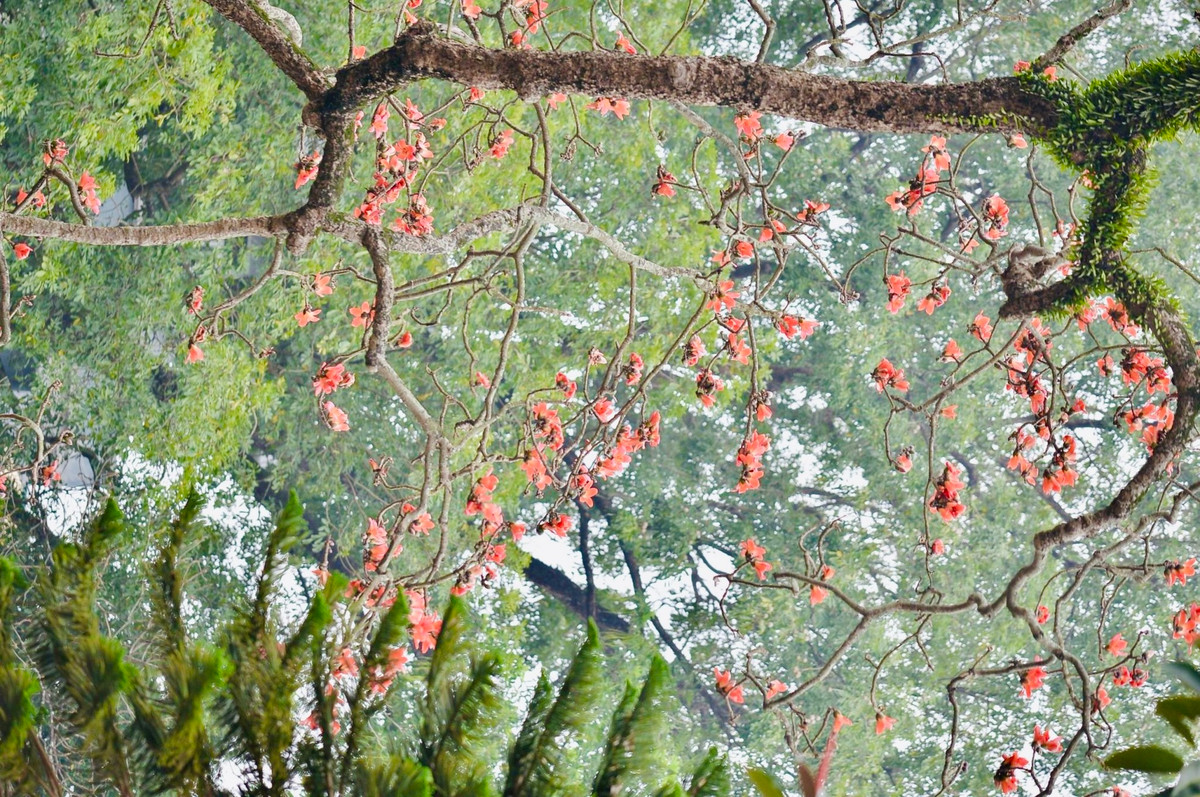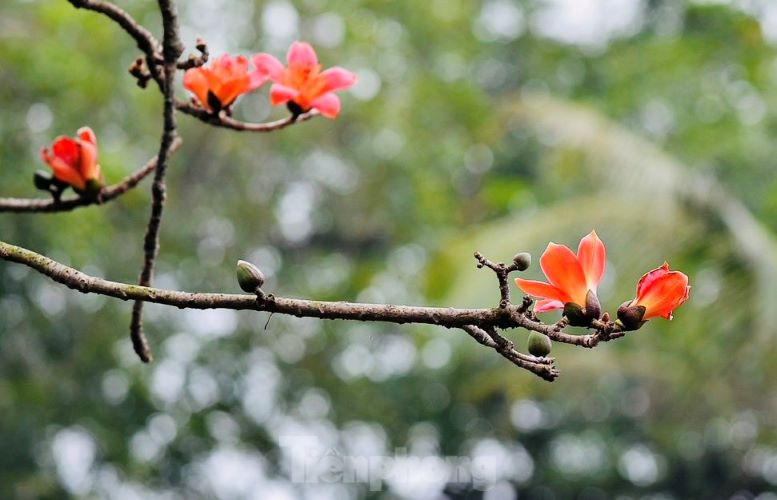 Trong mùa hoa, cây gạo rụng hết lá, chỉ còn những bông hoa đỏ rực trên cành.