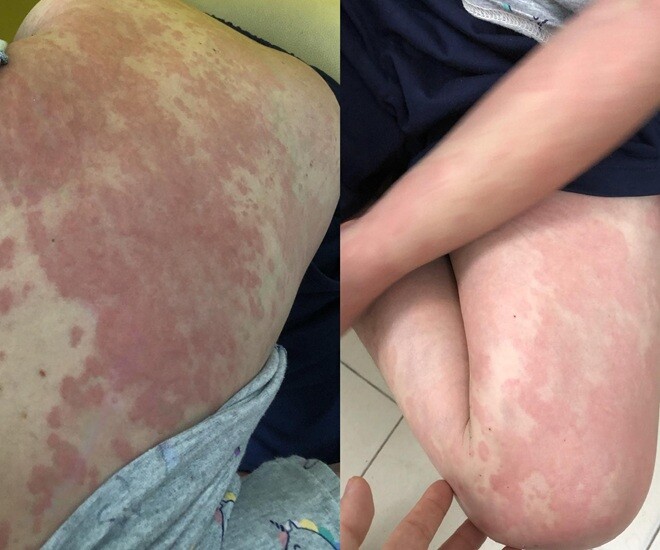 “Sau 3 ngày bôi thuốc không đỡ, tôi cho cháu đi khám và làm các xét nghiệm máu. Sau khi có kết quả, bác sĩ thông báo con bị dị ứng chất tẩy rửa bể bơi”, chị T.L chia sẻ. Sau đó, con chị T.L được truyền dịch, nhưng chỉ đỡ đươc khoảng 4 tiếng lại phát ban và ngứa trở lại. Những ngày tiếp theo, cháu có triệu chứng phồng rộng và phù lên mặt, tay và tiếp tục phải truyền dịch, tiêm.