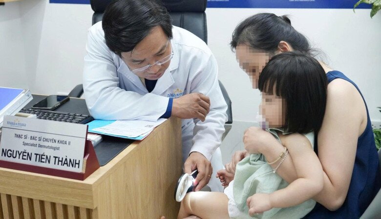 Bác sĩ Nguyễn Tiến Thành thăm khám cho một bệnh nhi bị viêm da tiếp xúc bội nhiễm. Ảnh: BSCC.