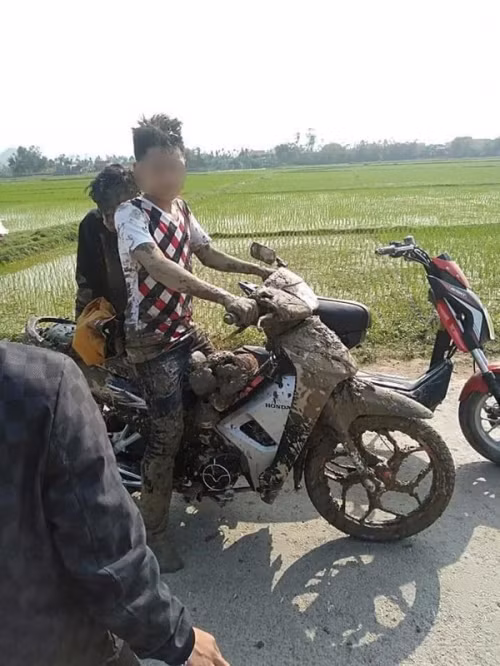 Cụ thể, xuất hiện trong hình ảnh ghi lại 2 cô gái đi chiếc xe máy màu trắng bị hư hại phần vỏ nhựa và đặc biết, người họ lấm lem toàn bùn, đất.
