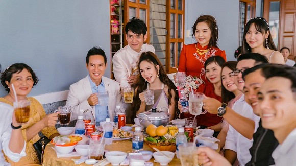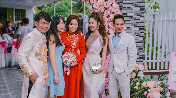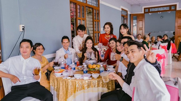 Vợ Lý Hải ăn mặc và trang điểm xinh đẹp khi đi đám hỏi cháu.
