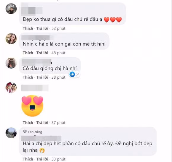 "Hai anh chị đẹp hết phần cô dâu chú rể rồi. Đề nghị bớt đẹp lại nha", "Anh chị đẹp không thua cô dâu chú rể", "Chị Minh Hà đẹp và dễ thương quá", "Cô dâu và chú rể bị lu mờ"... nhiều dân mạng bình luận.