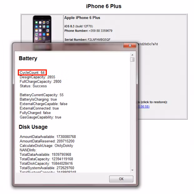 - Bước 4: Trên cửa sổ hiện ra, bạn có thể đọc được thông tin số chu trình sạc mà iPhone đã trải qua.