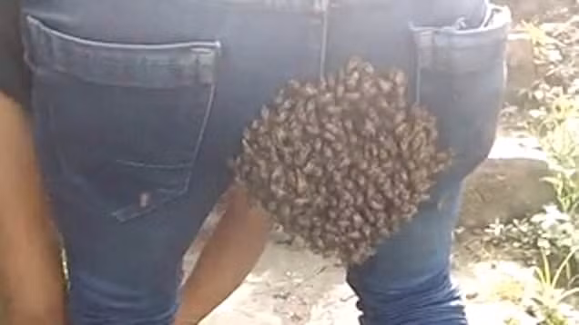 Những hình ảnh đáng kinh ngạc này được một người bạn của Velelhu ghi lại. "Chúng tôi đang trên đường đến một gara thì đàn ong bay đến, đậu trên quần của Velelhu và làm tổ", người này nói.