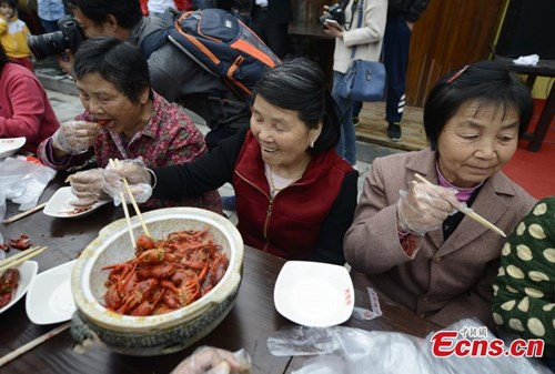 Trước hàng trăm quan khách, đầu bếp dị nhân Tang Chenggang đã biểu diễn màn xào tôm hùm đất bằng tay trần trong một chiếc chảo gang lớn.