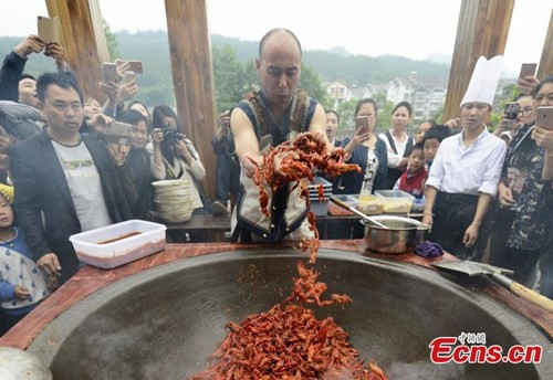 Tại đây, đầu bếp dị nhân Tang Chenggang đã biểu diễn màn xào tôm hùm đất bằng tay trần trong một chiếc chảo gang có đường kính lên tới 2m.
