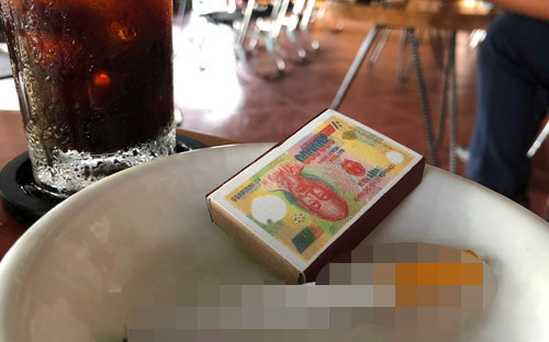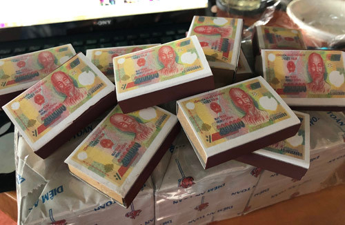 | Sản phẩm diêm Đồng Nai in hình tờ tiền trên vỏ hộp. |