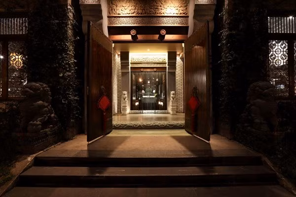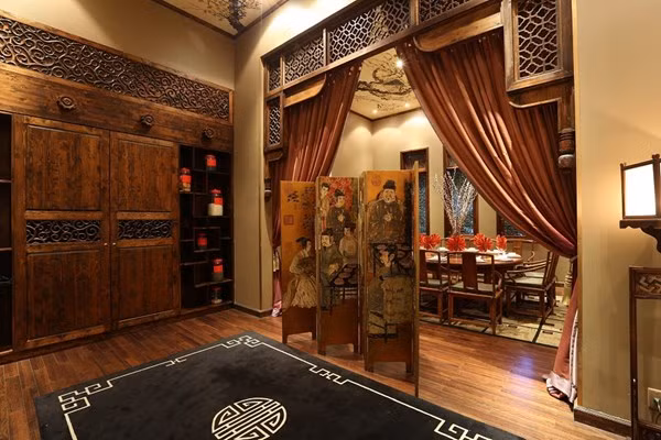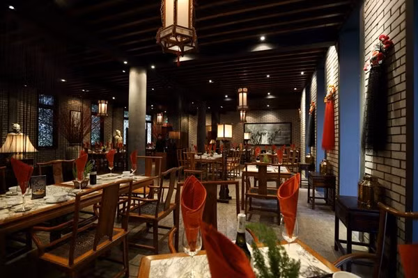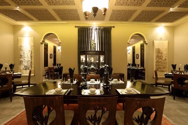 Sau khi thả bộ trên những bậc thang mát rượi, xuyên hành lang thơm ngát hương hoa sứ, một không gian nhà hàng thuần Việt với gỗ, phù điêu trang trí, họa tiết trên tường, những bức phù dung rải rác, tấm lụa mỏng tung bay khiến bạn như đang tiến vào cung điện hay ít nhất nhà của một vị quan lớn.
