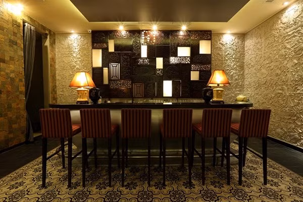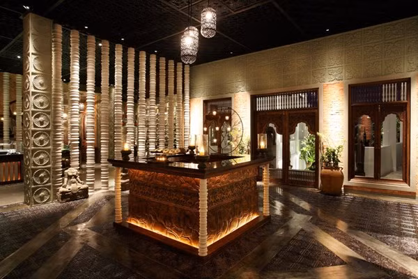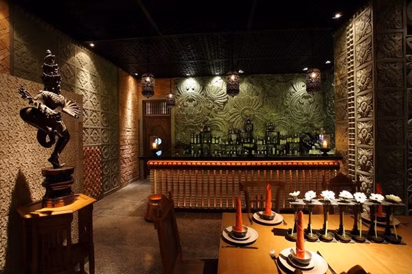 Sau cánh cửa dẫn vào nhà hàng là gian sảnh được thiết kế như tòa lâu đài của một vị vua Chăm Pa. Mảng tường gạch xếp so le phủ lớp ánh sáng đỏ kỳ bí, hàng cột đá ở Mỹ Sơn, các di vật cổ, tượng điêu khắc…