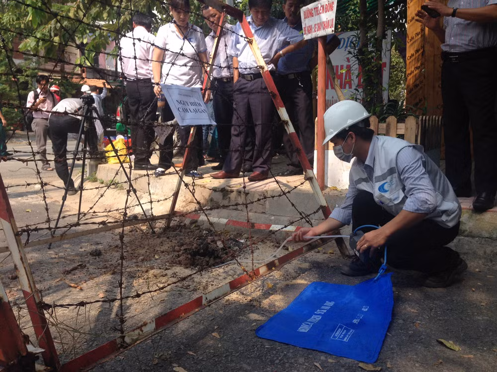 Giám đốc Sở Khoa học Công nghệ TP HCM Phan Minh Tân kiểm tra mẫu nước thu được từ vị trí phát nổ