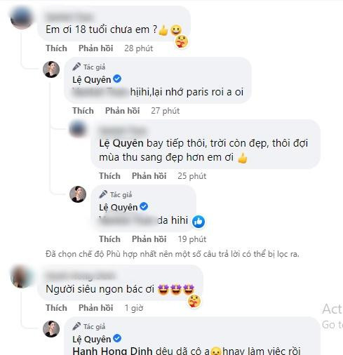 Góc máy từ phía sau trông vóc dáng của Lệ Quyên chẳng ai nghĩ là mẹ một con và ở tuổi 41. Sở hữu dáng người mảnh mai lại thêm vòng 3 "mẩy thật mẩy" nên nhìn từ phía sau trông Lệ Quyên chỉ như gái đôi mươi. Dưới bài đăng, rất nhiều người dành lời khen có cánh cho mẹ một con: "Em ơi 18 tuổi chưa em?", "Tưởng gái 18", "Người siêu ngon"...
