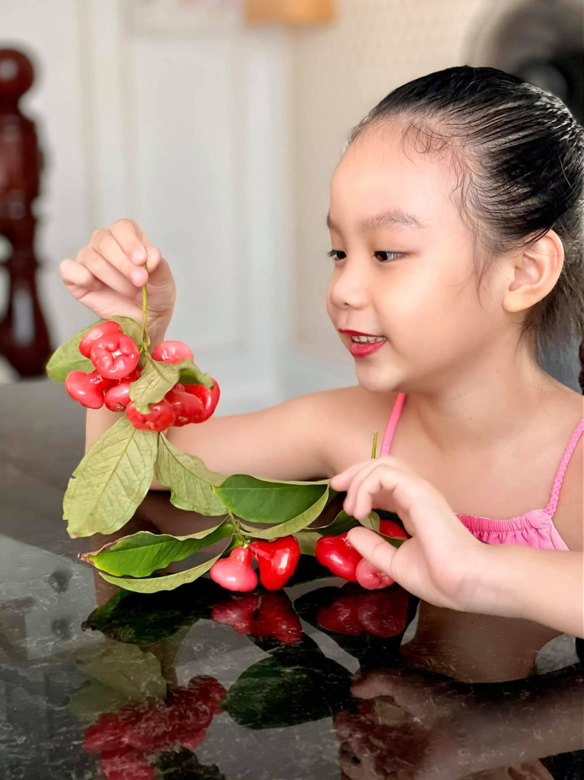 Vợ chồng Trịnh Kim Chi và các con thu hoạch trái cây vườn nhà rồi thưởng thức thành quả tại chỗ.