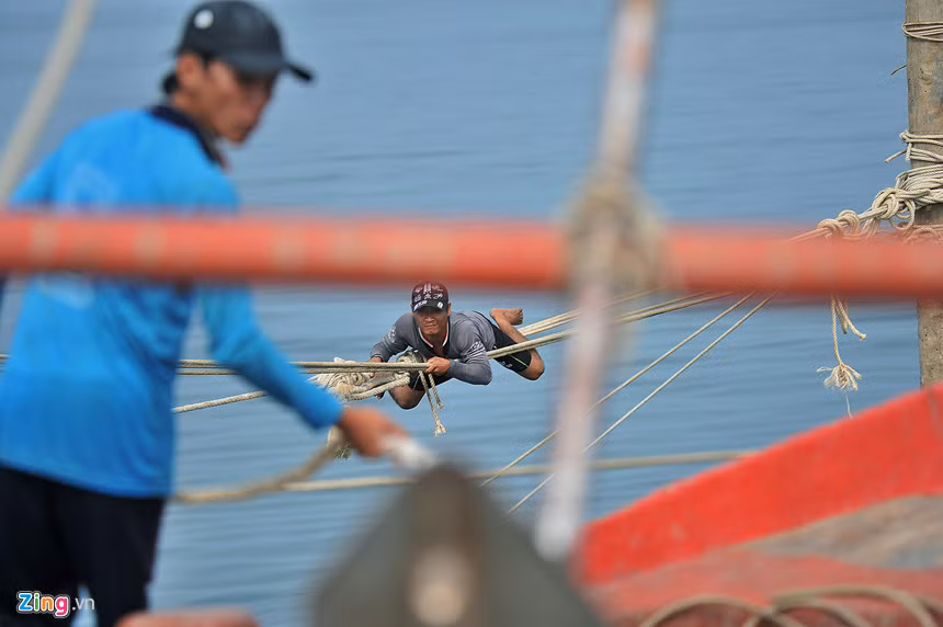 Hôm tôi có mặt, biển nổi sóng. Tuy không quá mạnh nhưng sóng cũng đủ gây thêm phần khó cho đoàn ngư dân. Gần 10 người đàn ông khỏe mạnh tập trung khu vực phía trước boong tàu cá, người thắt dây thừng chịu lực, người điều khiển gốc cột đáy, người điều khiển lực ròng rọc để nâng cột lên theo chiều thẳng đứng, người đứng ngắm để điều chỉnh.