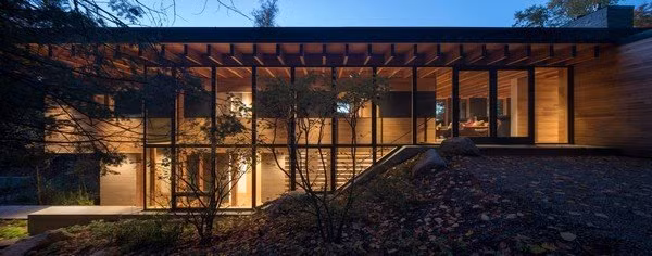 Ẩn mình sau rặng cây, ngôi nhà hai tầng có cấu trúc khung chính làm bằng gỗ tuyết tùng, cùng với các bức tường làm từ kính và các tấm xi măng. Kiểu dáng ngôi nhà được thiết kế sao cho hòa hợp với khu rừng xung quanh nhất có thể. Một bức tường kính lớn được đặt ở mặt tiền ngôi nhà cung cấp tầm nhìn ra toàn cảnh xung quanh. Các cột dầm gỗ kéo dài qua khỏi các bức tường tạo thành các hiên nhà ngoài trời.