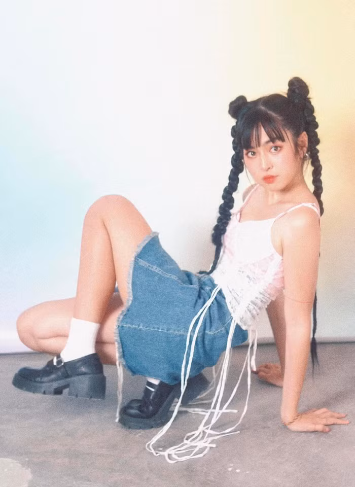 Nữ diễn viên chọn set đồ đậm chất phong cách Y2K với chiếc váy jean đặc trưng và áo hai nữ tính nhưng không kém phần cá tính. Điểm nhấn chính là mái tóc được búi cao hai bên và tết dài qua hông. Kết hợp cùng mái ngố xì-tin, Khánh Vân không khác gì một cô nữ sinh của những năm cuối thập niên 90.