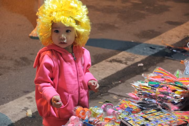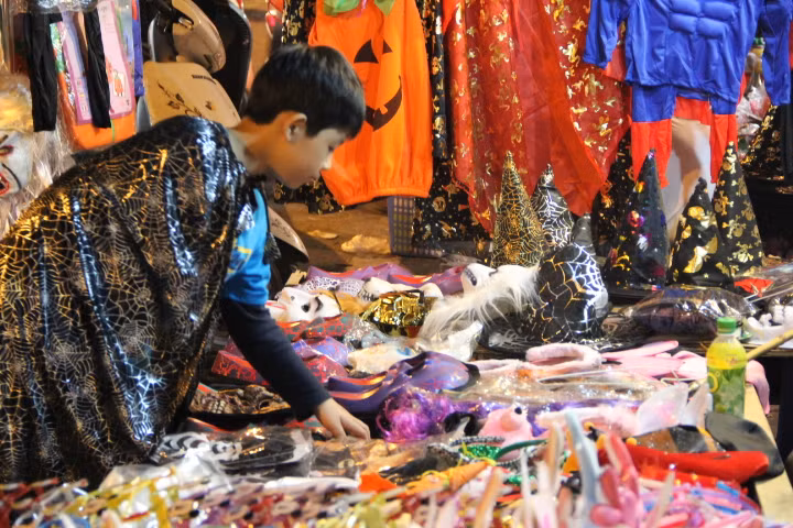 | Nhiều cô, cậu bé được bố mẹ, anh chị dắt đi dạo phố, mua tặng những món đồ hóa trang, mặt nạ ngộ nghĩnh. |