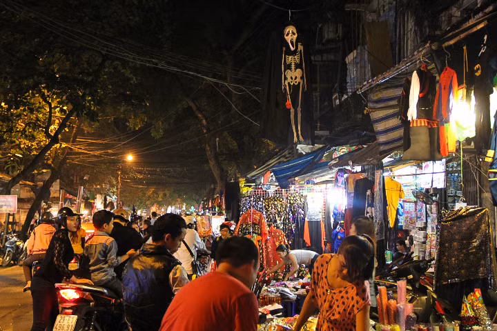 | Phố Hàng Mã tràn ngập hình ảnh đầu lâu, xương người, tạo cảm không khí ma quái trong đêm Halloween. |