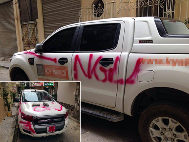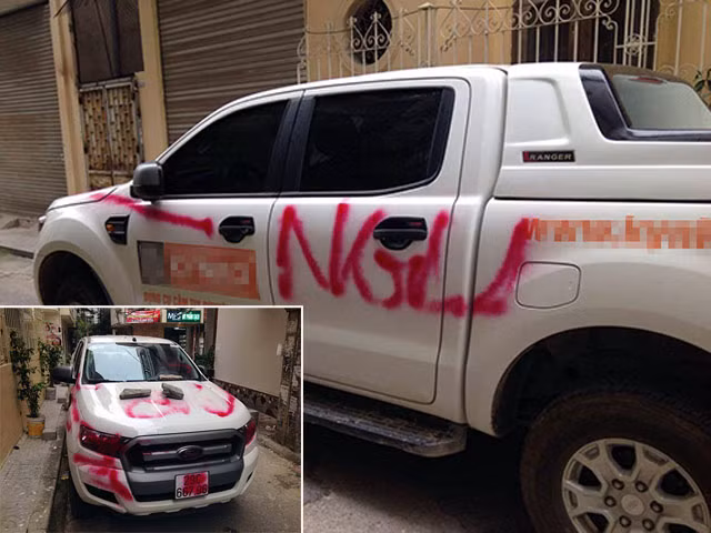 Khi quay trở lại lấy xe, chủ ô tô hẳn sẽ kinh ngạc lắm khi thấy hiện trạng chiếc xe. Chiếc xe đã bị ai đó dùng bình sơn, xịt quanh thân xe, nắp capo...