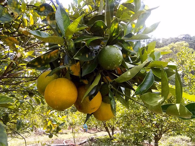 Trong vườn cam bà Na, những cây cam cao 4-5m, cành lá xum xuê cho thu từ 2-3 tạ quả . Bí quyết có vườn cam sai quả của bà Na là dùng thuốc sinh học chế biến từ...thuốc lào.
