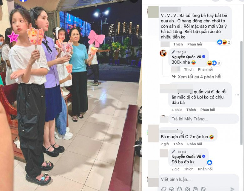 Đoàn Di Băng đứng cạnh đàn con của mình trông trẻ như chị gái. Có quan điểm còn cho rằng, quý cô đã mượn đồ của Hana (con gái đầu) để mặc. Ông xã cô là Nguyễn Quốc Vũ đã đính chính rằng, combo này cô đặt mua online với giá rất rẻ, chỉ 300.000 đồng để mặc cho ngày lễ trọng đại này.