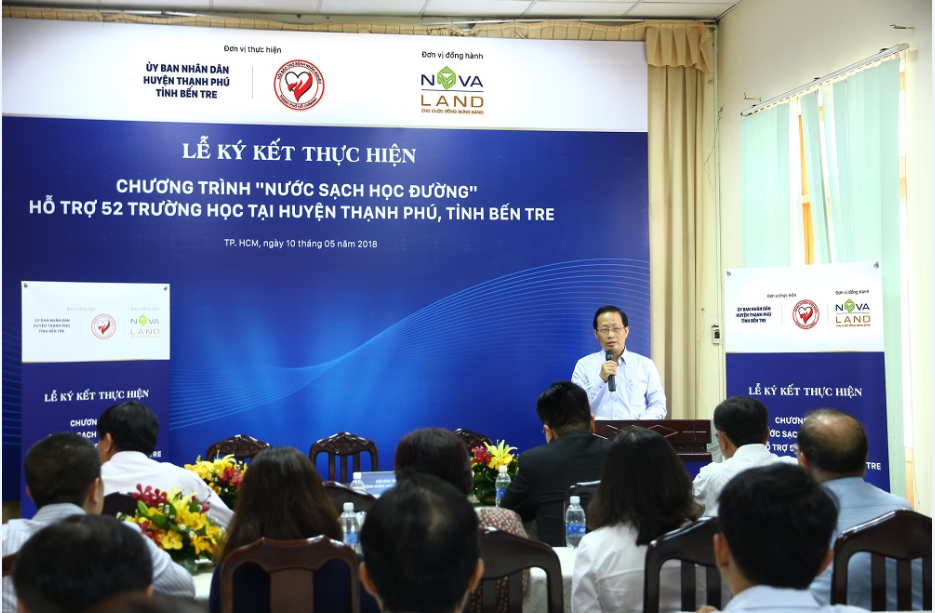 Ông Nguyễn Trúc Sơn - Bí thư Huyện uỷ huyện Thạnh Phú, Tỉnh Bến Tre cho biết: “Huyện Thạnh Phú có 26 km đường giáp biển. Biến đổi khí hậu đang là cản trở lớn cho việc phát triển kinh tế của huyện, vốn chủ yếu là làm nông nghiệp. Một năm 12 tháng thì khoảng 3-6 tháng huyện bị tác động của tình trạng xâm ngập mặn. Cả huyện chỉ có một nhà máy nước, đáp ứng được 1/3 nhu cầu của 150.000 người dân. Về giáo dục, toàn huyện chỉ có 3 trường có bể chứa nước và máy lọc để sử dụng, tạm đáp ứng nhu cầu của học sinh và giáo viên. 52 trường được đề xuất trong chương trình có điều kiện còn khó khăn, chưa có nguồn nước đảm bảo vệ sinh. Do vậy, chúng tôi rất vui mừng khi đoàn công tác của Hội, Tập đoàn Novaland và đơn vị kỹ thuật đã đến khảo sát, nghiên cứu và tài trợ cho huyện Thạnh Phú để triển khai chương trình “Nước sạch học đường” năm nay.”