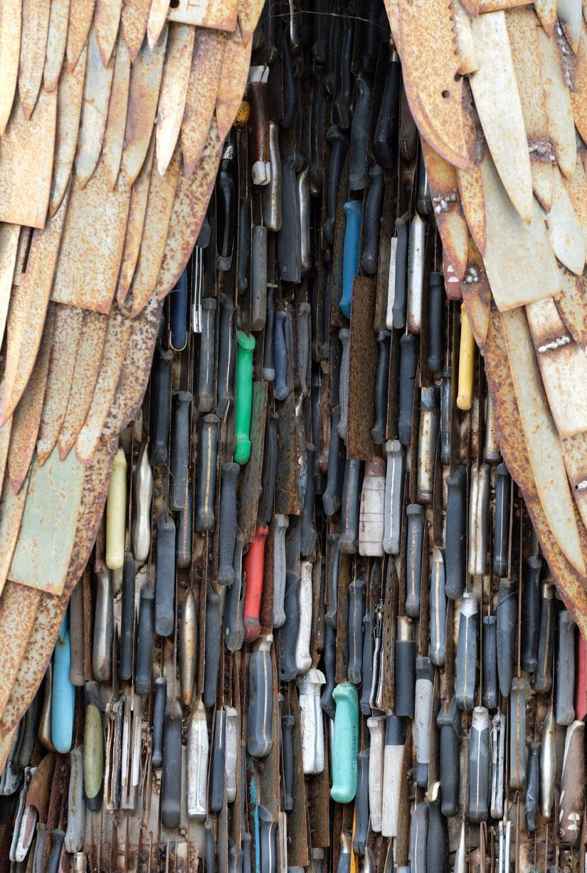 “Knife Angel” là bức tượng được làm từ 100.000 con dao, trong đó hơn 30% chiếc được chuyển đến cho các nghệ sĩ với những vệt máu.