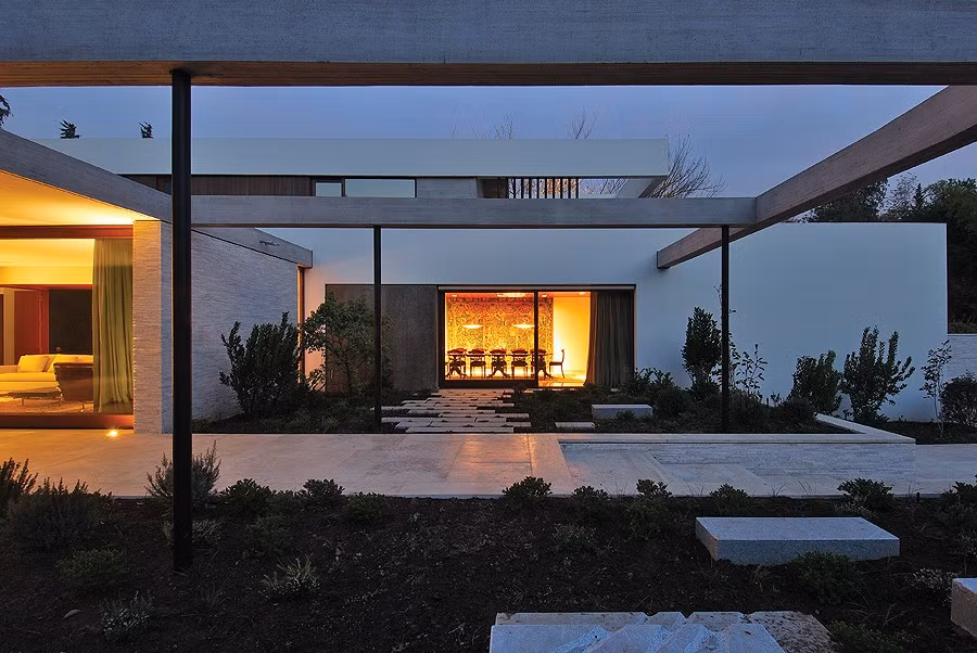 Không gian ngôi nhà được thiết kế theo dạng hình chữ “H” nhiều góc mở, tận dụng ánh sáng tự nhiên, có tầm nhìn rộng ra xung quanh giữa thảm thực vật xanh trong lành và tươi mát.