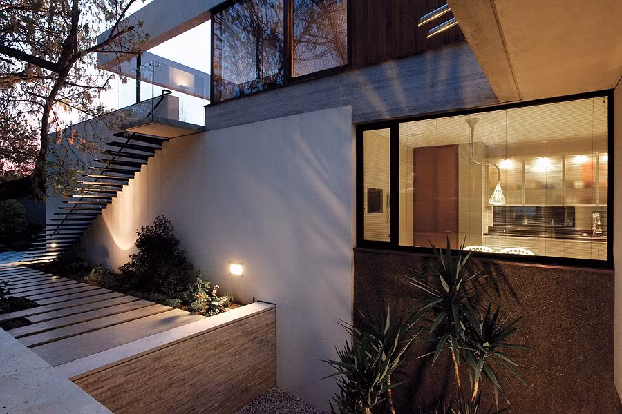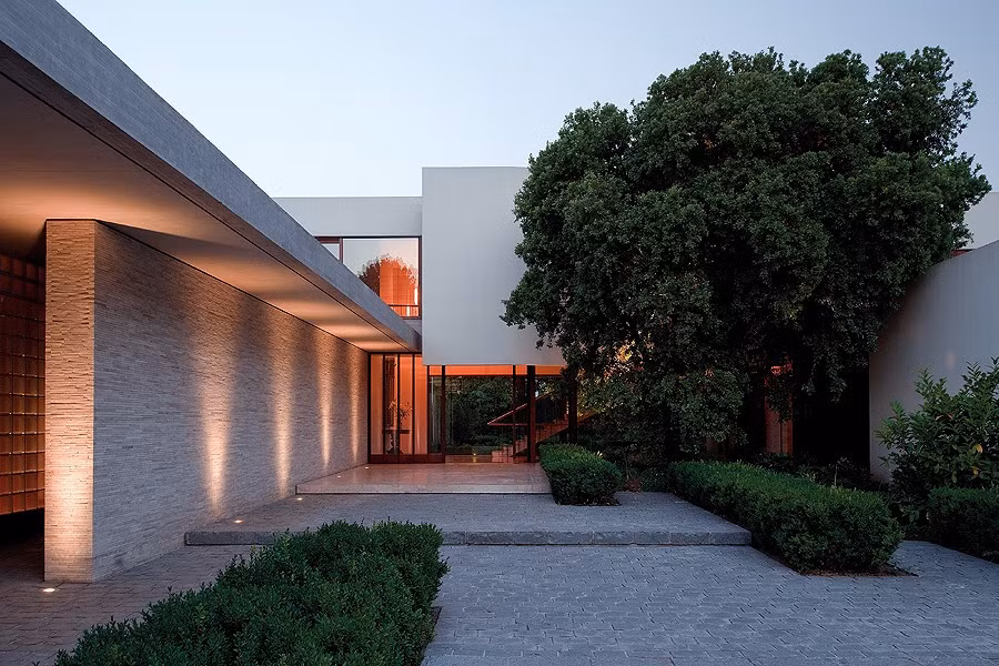 Ngôi nhà có một sân rộng lớn được thiết kế như bãi đỗ xe khách, tạo ra một lối vào dài dẫn đến cổng chính tăng cảm giác cởi mở cho căn nhà.