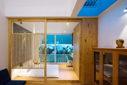 Vách ngăn giữa các phòng là khung gỗ thưa, tạo cảm giác thoáng mát.