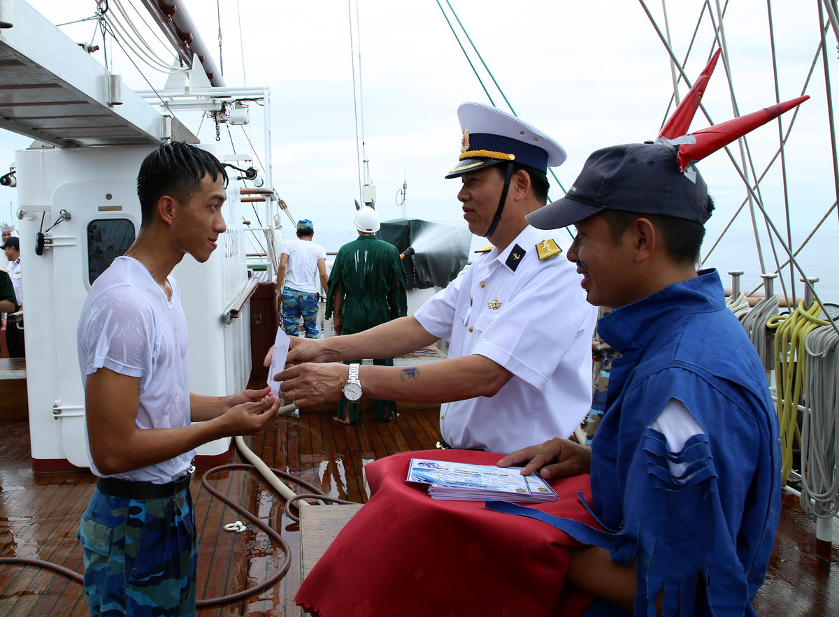 Theo truyền thuyết, nghi lễ nhằm cảm ơn của những người đi biển đối với các vị thần, đặc biệt là thần biển-người đã chở che, giúp đỡ để các thủy thủ có đủ sức mạnh tinh thần và thể chất điều khiển con tàu vượt qua những thử thách, chông gai của hải trình. Ảnh: Thủy thủ nhanh chóng có mặt trên boong tàu để làm các thủ tục mô phỏng nghi lễ.