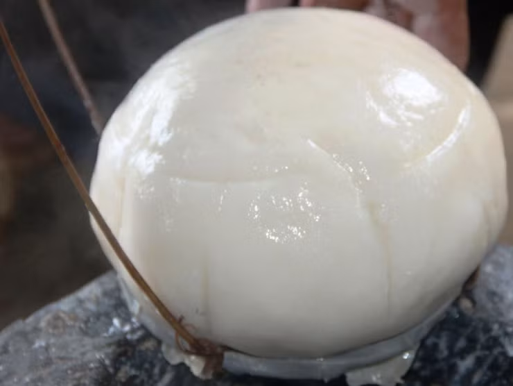Quả bột sau khi được luộc thì vớt ra cho vào cối giã cho dẻo. Giã xong lại đem nhào nặn cho đến khi bột nhuyễn rồi nặn thành từng quả bột nhỏ vừa với diện tích của khuôn ép bún. Sau đó cho vào khuôn rồi ép từ từ thành những sợi bún chảy xuống nồi nước sôi trên bếp. Khi sợi bún nổi trên mặt nước thì vớt bún ra đem ngâm xuống chậu nước sạch cho đến khi sợi bún săn lại thì được.