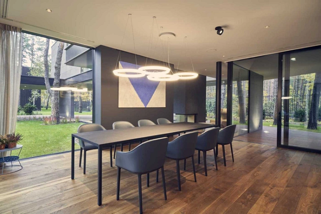 Các không gian bên trong, như phòng khách và phòng ăn, gợi nhớ đến một phòng trưng bày nghệ thuật riêng. Trần nhà cao cùng nhiều cửa sổ giúp ngôi nhà trở nên rộng rãi và thoáng đãng hơn.