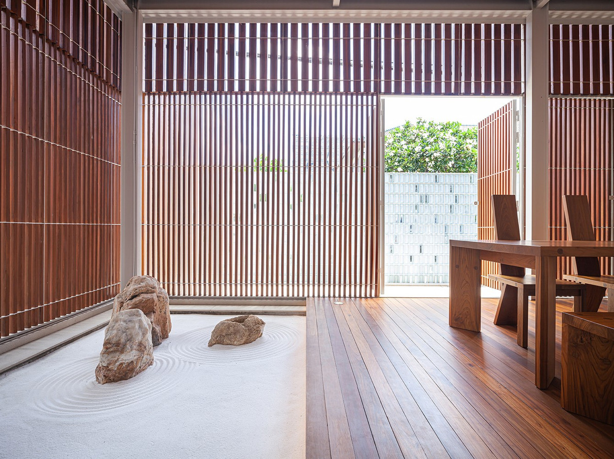 Giếng trời được bố trí ở giữa hành lang, giúp bổ sung ánh sáng tự nhiên cho cả ngôi nhà và duy trì sự kết nối với môi trường xung quanh.
