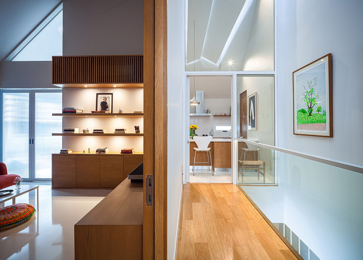 Các kiến trúc sư đã thiết kế trần dốc ở hai bên nhà để tăng sự riêng tư cho gia chủ.