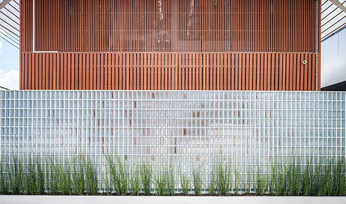 Việc sử dụng vật liệu mờ ở hàng rào khối kính và tấm mờ cho mái hiên vừa giúp giảm độ rắn chắc của khối, vừa giúp đảm bảo sự riêng tư của người ở.