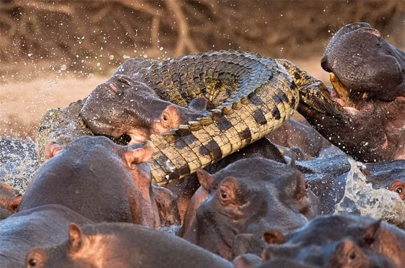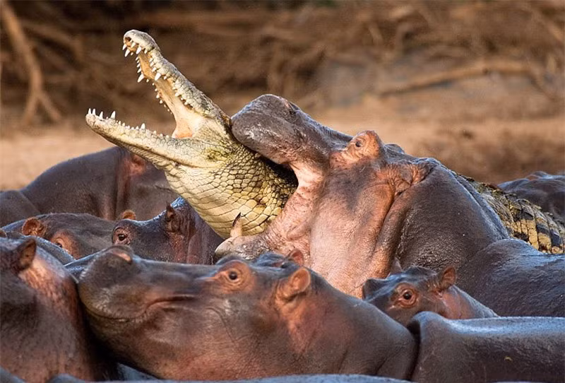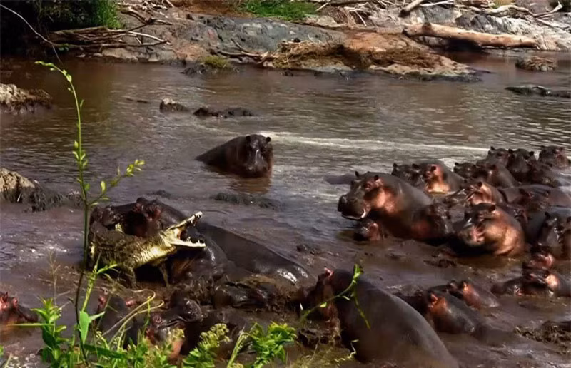 Tuy nhiên, trong khi con vật đáng thương đang tập trung hết trí lực để đối phó với bầy chó săn thì bỗng nhiên một con hà mã to lớn xuất hiện đánh lén nó từ phía sau. Dường như con linh dương đã vô tình xâm phạm vào lãnh thổ của hà mã. Do đó, nó đã bị chủ nhà trừng phạt theo bản năng. Nhưng, chú linh dương quả cảm không vì lâm phải hoàn cảnh ngặt nghèo mà từ bỏ hy vọng sống. "Ăn miếng trả miếng", sau khi bị hà mã đánh lén, linh dương đã ngay lập tức dùng cặp sừng sắc nhọn của mình để đáp lại.