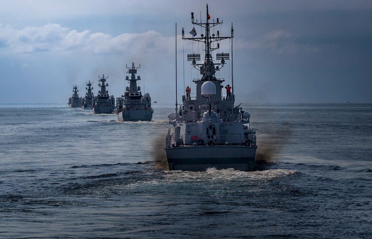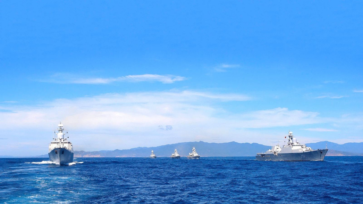 Lực lượng tàu mặt nước của Hải quân luyện tập diễu binh trên biển.